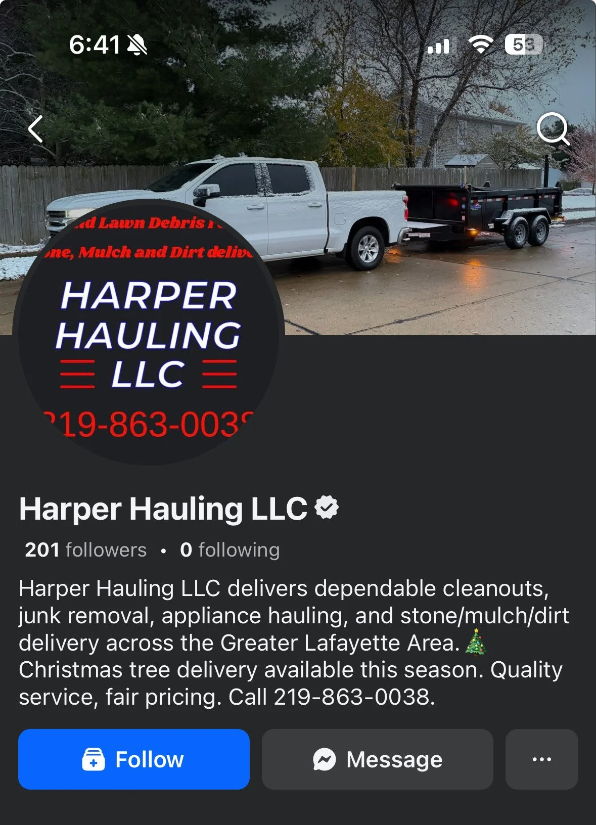 Serving the Greater Lafayette Area with dependable dump trailer services. We’re a new family-owned company offering Clean-Outs, Junk Hauling and Material Delivery. We are dedicated to honest service and helping our community.